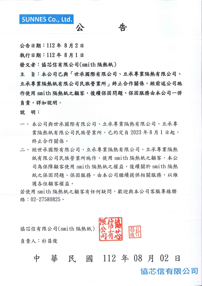 【公告】The Smith與授權經銷商立承/世承終止合作關係